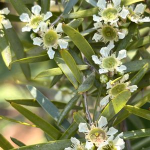 🌲樹に咲く花🌲 原産地はオーストラリア🇦🇺 花は小さくあまり目立たない。 葉は細長く繊細で〰︎ 涼しげなシルエットです🎶 (近所のお庭 地植え) レモンティーツリー フトモモ科