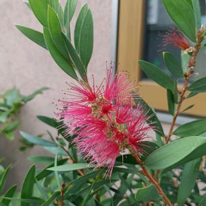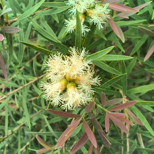 メラレウカレッドジェム。今年も咲いてる。フトモモ科だけど、実は食べられないんだよな〜。。。ザンネン。。。 現在、時期的には全体が咲き終わって枝の数本に残ってる花。新芽が赤いのが特徴ナリ