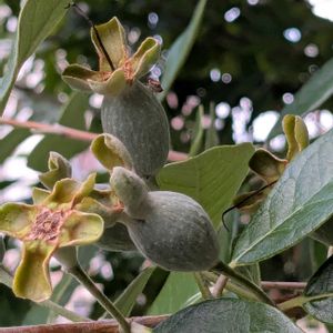 フェイジョアの実が大きくなって来ました。2ページ目はフェイジョアの花、6月に撮ったものです。 雨の予報が出るも、ほとんど雨が降らず蒸し暑いです🥵