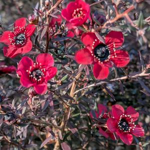 ギョリュウバイ 喉の調子良くない時にはマヌカハニー🍯 ギョリュウバイ(マヌカ)の蜜は抗菌作用があって、葉から採れる精油もアレルギーに効くらしい♬ 一重咲きの赤い花の花盤は黒く、蜜がてかてかと光っている 真っ赤な火曜日🏷🔴 雄性先熟で、たくさんの雄しべの中央から雌しべが突き出してくる🖤火曜はマクロの発表会🏷 花弁が落ちたあと、花盤はドーム状に盛り上がって、実になってもしばらく雌しべの柱頭が残っている🟤