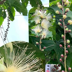 サガリバナ(サワフジ) サガリバナ科 庭木です。ちょっと苦手な子😅 写真の中の情報が渋滞しててすみません。忘備録として、記録させてください🙇♀️ 花は芳香があり、右側の様に長い花蔓が夏中、何十本も出て、花は太陽が沈む頃〜朝までの一晩のみ上から5.6個ずつ開花し、ポトっと落ちます。開花〜朝まで、蛾とミツバチが🐝めっちゃ混み合います。 花の蕾の蔓は120センチほどありました。花の直径は約5センチ弱。 木の高さはほっとくと二階の屋根を越えると思います。 (台風前後で剪定したり、台風で折れたりするので、3メートルくらいをキープしてます。花の蕾蔓も、台風で風に激しく揺れて当たると痛い😢ので、台風前にカットします) 川辺にあると、落ちた花が水に浮いて流れていくのはとても素敵です。 が、ここは庭。朝早めにお掃除しないと、落ちた花の蜜を求めアリンコ🐜大集合です。 でもまだ落下してない花に🐝と蛾がすごくて、なかなか掃除できないという現象が起こります。 もうお別れする?そのままおいとく?と検討中。 ほったらかしもなんだかな〜なので、ちゃんと記録しておこうかと。