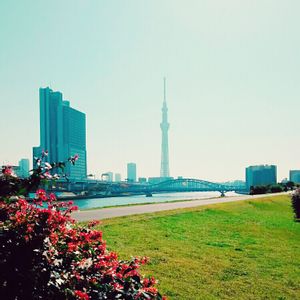 スカイツリー🗼の見える好きな場所です☆ 紅葉した“アベリア” 🌿と一緒に今空📱
