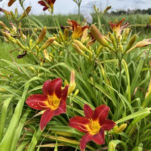今日のお花🏷️カンゾウ あまりに赤いカンゾウなのでカンゾウなのかをおさらい。葉っぱはシュッとしてるからユリじゃない。ひとえだからヤブカンゾウじゃない。この蕾の量は一日花ならではに違いなし!黄色い子もそばにいる。06月14日📸小岩菖蒲園横の江戸川河川敷 3枚目、カンゾウのような花の大きさ、色と咲きっぷりだけど葉っぱが違うよ、ユリだね!06月22日📸近所の花壇