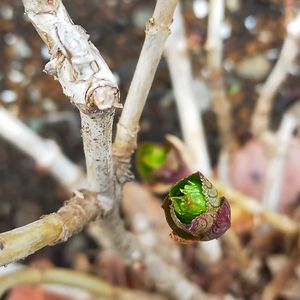 紫陽花。 枯れていたところから 新芽が出るこの瞬間が 一番好き。
