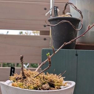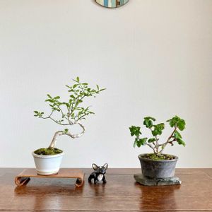 マユミ(樹高20cm)と夜叉柄杓(樹高11cm)です。マユミは小さな蕾が付いています。夜叉柄杓は小さな花が一輪咲きました。 Mayumi (20cm tall) and Yashabishaku (11cm tall). Mayumi has a small bud. Yashabishaku has a single small flower. 🌱🌸