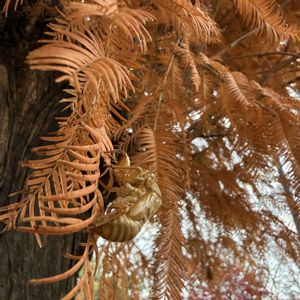 みらい公園のメタセコイヤの紅葉が見頃を迎えていました。 😊👍🎶📸 よく見るとそこに"蝉の抜け殻"が ついていた。🤗