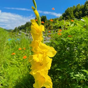 こんにちは😊 畑には黄色のグラジオラスが咲いてました。 暑くて汗だくだけど青い空と自然の緑とお花に癒されます♪