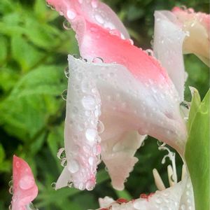 グラジオラス 今日は雨粒が美しく お化粧してくれました♬ どう?綺麗でしょう?🤗💕💕 7:23撮影