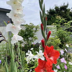 白のグラジオラスの花言葉 『密会』だって➰ 清楚な白なのに 花言葉過激🤣🤣🤣 手前に赤の百日草が… カラフルなグラジオラスだけど 白も落ち着く…♡