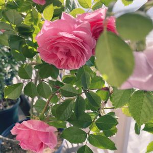 バラたちでーす お花はありません😂でも成長期でめちゃ綺麗な葉っぱがたくさん出て、背丈もどんどん伸びています☺️ ①フランソワジュランビルこの子の伸長力、噂通りすごい❣️伸びた枝がフワフワ揺れて🦋みたいなんです❤️ 毎日見ていて飽きません☺️葉の形も色も大きさも好き〜。12号に植えればよかったかも😅隣はナエマ春の花後、横に扇状に誘引できました! ②アミ、レイニー、フロレンティーナのーコーナー 昨日雨風強かったので、鉢を回転させ新しい枝を室内側に向けました。これでシュートを守ります! ③レイニーの極太ベーサル。支柱にしっかり留めました。 これは期待枝ですので😏 ④こちらもナエマ。葉からも、優しいハーブみたいな香りがします。今年は調子良さそう👍