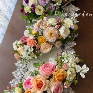 ①今日のアレンジメント教室は、細長ーい白いお皿にバラをたっぷり使ってアレンジして頂けました。 やっぱり5月は、バラですね。 ②パープル系でまとめたシックな感じ ③オレンジとピンクで、華やかな感じ ④くすみカラーとパステル調の優しい感じ ⑤今朝摘んで、水あげしていたお花たち。 今日は可愛い子が咲いてくれました。