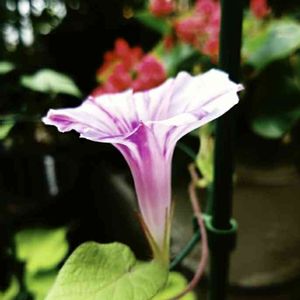 今朝の朝顔。 左側の青紫のは、切り咲き。 真ん中ピンクは、美笠。 右側くすんだ赤は、団十郎。 一緒に植えてあるグロリオサは、そろそろ終わりです。