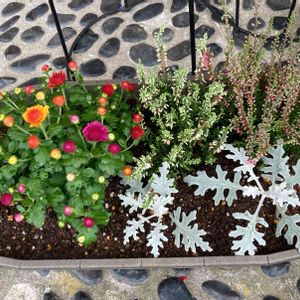 玄関前寄せ植え 花壇に植える宿根草を探しにホームセンターに行ったらガーデンマムがあまりに可愛いので連れて来てしまいました💕