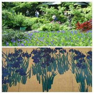 根津美術館(東京 青山) 5月の初旬になると美術館の 庭園にカキツバタが 見事に花を咲かせます そして同時期に尾形光琳の 「燕子花図屏風」が展示 されます 今は休館中… 来年は是非訪ねたい… 上 2018年5月撮影 下 「燕子花図屏風」ポストカー ドより
