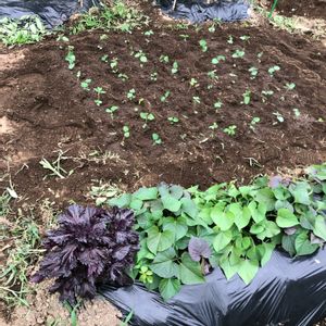こんにちは☁️ 枝豆の苗が 出来たので植え付け して来ました。 アルバリン虫除けもして バッチリかなぁ😊 手前のさつまいも🍠も 茂って来ましたよ🙆