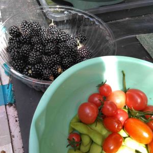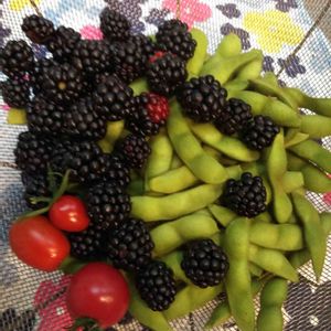 今日の収穫! ブラックベリー。自然に落ちてしまうので 急いで収穫! プチトマトと枝豆。 枝豆はすぐ茹でて食べました。