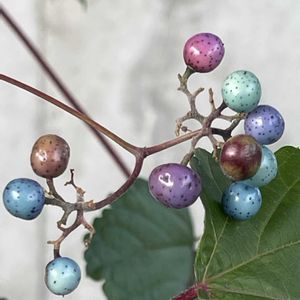 おはようございます😃 ノブドウの実が🟢〜白、紫🟣、青と変化するのが、宝石のようで、美しいです。散歩にて。