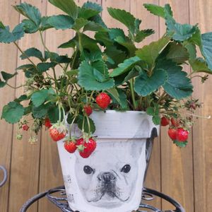 🏷️毎月15日はいちごの日🍓 ①②デコパージュ鉢 ③⑤今日は父の誕生日🎁🎂 祝88才『米寿』グレーのTシャツの背中は『あと12年は使います』笑 ④ワイヤーかごのギャザリング💚カリブラコアが少し咲いてきました
