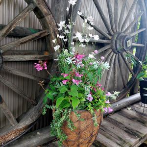 ギャザリング講座にて🌿 ヤシマットのワイヤーのカゴに ソフトクリームのような背の高い寄せ植え これからカリブラコア、トレニア、ヘリオトロープが溢れるようにモリモリ咲く予定🤍🩷 また投稿できるといいな