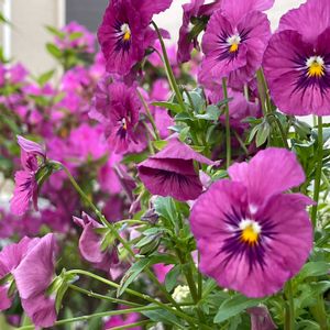秋植え、寒冷地を冬越ししたパンジー。 たわわです。 後ろのツツジと同色!! もしかして 今年の配色は紫多めかしら? 毎年私の気分なのか その色が多いという傾向があって。 去年はブルーだったかなあ。 ピンクの年もあるし、黄色の年もあるし、 なんか面白い☺️
