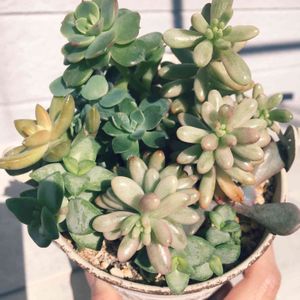 ダイソー産の寄せ植えダイソー鉢に完成(*⁰▿⁰*) 右のハオルオアはオブツーサかなぁ…奥のピンク色になったハオルオアは枯れかけの色!? 真ん中はエケベリアだったし、ピーチフリデじゃあないかと思って選んできた(^・ェ・)ジー… ハオルオアを混ぜて寄せ植えって考えてなかったけどやってみるとなかなか悪くないかな!? と自画自賛してみるのでした笑 |柱|qω〃)ポッ ハオルオアは種類わからないだろうなぁ…と思っててのお名前教えて!です💦 今日はカインズでチョコレートもふもふも購入したけど土が足りずまた今度(ノロ≦*) それにしても…やっぱり好きな多肉だけを買って寄せたり1つだけドンっと植えたりした方が、やっぱり良いかもな…と考え直しているところなのです… 寄せ植え下手だからか気に入らないのも多いのが現状かなぁ(;^ω^) 追伸: お名前たくさんありがとうございます(*⁰▿⁰*) 左から…『ハオルオア 宝草』 南の風さん、ありがとうございます♡ 真ん中『高砂の翁』 自然大好きさん、setstkoさん、ありがとうございます♡ 右端『ハオルオア 名称不明…』 みきさん、ありがとうございます♡