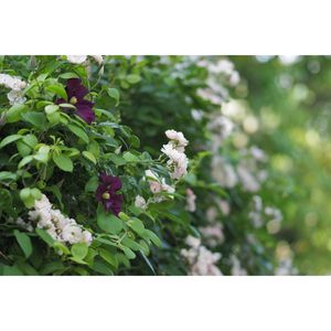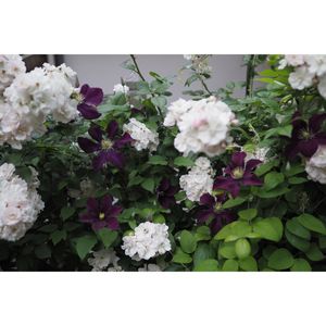 ◆いつもの箱庭 すでに終盤を迎えたペレニアルブラッシュ(蔓バラ)の脇で篭口(クレマチス)が咲いています。