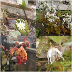 今日の母の庭2 ②ヒトリシズカが咲きました。 ③碇草一番花です。 ④丹頂の羽根(草)が広がり始めました。 ⑤羽団扇楓の花芽が出ました。