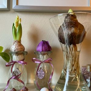 皆さま長らくのご無沙汰ごめんなさい🙇♀️ 膝を故障して行動範囲がうんと狭まり、投稿をサボっておりました💦でも元気です❣️😃 またゆるゆると写真を上げて行きたいと思います。どうか気長にお付き合い下さいますようお願いします🥰 ヒヤシンスの水栽培を始めて丁度1ヶ月✨ 白、紫、ピンクと3色植えましたが、 紫はカビで昇天😭 買って帰った時点で様子が変だったのに、お店に戻るのが面倒でそのまま植えたのを後悔🥲 ピンクはカビた皮を剥いで何とか救命。 マッパなので🙈💕ドレスを着せました👗緑の芽がポツポツと顔を出してます。 白だけは驚くほどスクスク育ち、今朝蕾がふっくらと開き始めました❣️ 昨日友達から、クリスマスプレゼントに🎁🎄アマリリスの水栽培セットを貰いました❣️ ヒヤスンスの事は話していなかったのに テレパシー⁉️ それぞれのペースで育っていく可愛い子達、毎日眺めて楽しんでいます🥰