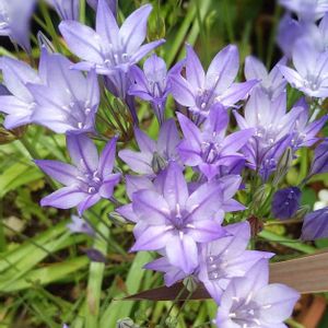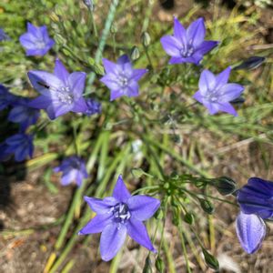 鮮やかな青紫色の花が 放射状にいっぱい咲いています。 ☔を逆さまに広げたようなこの花は ブローディア トリテレイア…。ちょっと覚えられませんね…。 アガパンサスを小さくしたような花姿から 和名は姫アガパンサスです。 この名前なら大丈夫ですね。 よく見ると花びらに6つの濃い青紫色の筋がありその濃淡のコントラストが とても綺麗でお洒落です。 北アメリカ西部原産。 ユリ科トリテレイア属の球根多年草。