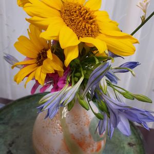 2022.6.6 ☔のち曇り [ミニひまわり🌻姫アガパンサス・ローズゼラニウム・オリヅルランの花] 庭のお花をブーケにして、リビングに飾りました。