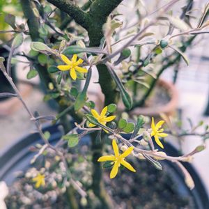 コロキアコトネアスター 小さなしずく型の葉は表がグリーンで裏がシルバー、枝葉はブラックでコキコキと曲がったように伸び、とても個性的で私好み💕 とっても大きく育っていたけど、去年暑さなのか寒さなのかダメージを受けて枯れてしまった枝があり、少しコンパクトなサイズになりました。 それでも今年はまた小さな可愛らしい黄色の星型の花を咲かせてくれました🥰 キュンキュンだよ〜😍