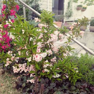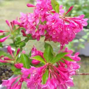PWさん ワイゲラソニックブルームピンク ワイゲラソニックブルームパール どちらも2年目✨ ソニックブルームパールは ベビー苗からですが ソニックブルームピンクは 完全に売れ残り(タグも古くさかった…)で 枝も暴れまくってたもの 形はいびつですが お花は真っ赤てとてもキレイです😄 トリロジーも楽しみだな🎶