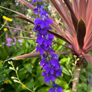 オルレアの間から青いニゲラが顔を出してる
