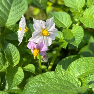 庭を見たら一輪咲いていた🎶 今から実がまるまる太ってくるんだね🎶 楽しみ楽しみ🥔 今年はオクラと万願寺とうがらしの種の芽が出てこない🥲