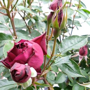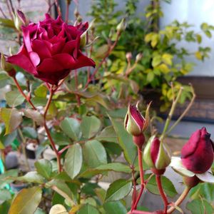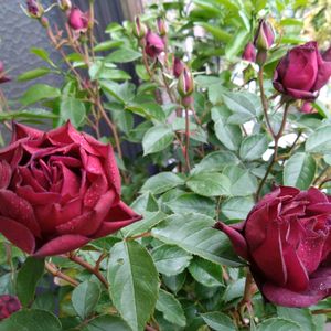 ライラ今が最盛期〜🌹🌹🌹 この子もこの色味がたまらんのです♡(˃͈ દ ˂͈ ༶ )♡ 赤いけど少し黒味も入って影のあるような‥でも光が差すと紫っぽく見えるところもあって……深みがあって、ほんとに大好き💜🥹 毎年行くバラのセレクトショップに、ライラの新苗売ってた🌹💜庭が広ければもう1鉢ライラ欲しいよ〜🌹😚