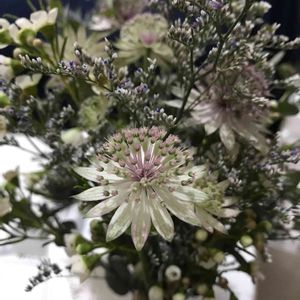結婚式の帰りにお裾分け頂いた花束。 ユーカリやなどもはいってて 素敵。 この白い花、なんだろう。