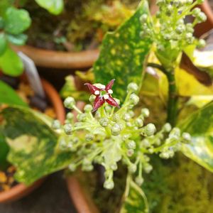青木(アオキ) 駿河弁天 幼苗を買って2年目、初めて花を咲かせました‼️ 5㎜位かな? カミさんに「アオキが咲いた」と教えたら「どれどれ?」 「これ❗」と指差して見せると「えーっ、老眼鏡がないと見え~ん‼️」 😅😩🤓 つまんない花だけど、ちょっぴり嬉しかったんだな、これが🤗 因みにアオキは雌雄異株でこれは雄花です。雌株の満月もあるんだけど、そちらはまだ咲かなさそう😢