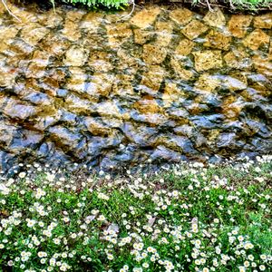 仕事帰りに🤳 川の石垣に可愛いお花が咲き、一の坂川の川底は石畳が敷かれていました。