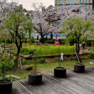 桜の手前の菜の花を見に近づくと人影が。。 田んぼビオトープで、田植えの前は菜の花らしいのですが。 今どきの案山子って、こんなの?😂 🌷も綺麗に咲きましたね。