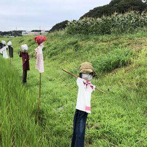 藤岡市下栗須の遊休農地にボランティアさんが植えているコスモス畑、花はまだ少し早かったけれど,たくさんの案山子が出迎えてくれました!!26日以降は摘み取りも出来ます❣️ 最後のヒデちゃんカカシ似てますよね!!