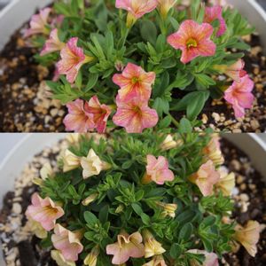 こんにちは👋😃 今にも雨が落ちてきそうな天気です☁️ サンフラアンバサダー2023第1段の サフィニアプチさくらもこもこ サフィニアアート小梅ちゃん ミリオンベルアンティークオレンジ ミリオンベルアンティークレモン 今日の様子です😃 さくらもこもこは鉢がピンク1色に染まりとても可愛くなってきました😊💕 ミリオンベルアンティークレモンがやっと開花😁のんびり屋のオレンジも蕾の頭が出てきたので早く🍊と🍋のコラボが見たいとモヤモヤしながら見守ってます😅