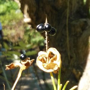 ヒオウギの(檜扇) の実 アヤメ科 原産地 日本 東アジア~南アジア 花は6-7月頃咲きます。 PICの黒い実(種)は ぬばたま といいます。 万葉集にも登場しますね。 このつややかな黒い実を蒔くと発芽率100パーセントです。🌱🌱🤗 生長と共に扇の形になった葉になり綺麗な花を咲かせます。🌸🥰