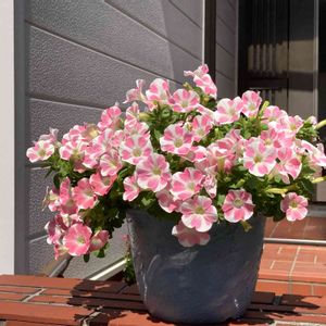 ペチュニア桃色ハートとリメイク鉢☺️ 夏を超えていい感じ💕 上から見ると、、、切り戻しした方がいいんだけどコレからでも間に合うかな? 取り敢えず、高いところに置いて、カバー☺️☺️ 鉢も目立つから、セメントと水性ペイントでリメイク、100均一のプラ鉢です😅 どうかなぁ☺️☺️