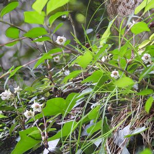 咲き初めは下を向いてますが、咲き進むとだんだん上向きに♪ ウメガサソウ(梅笠草) ツツジ科 ウメガサソウ属 常緑小低木 北海道、本州、四国、九州に分布。 丘陵、山地の林内に生育。 根茎は下向きに又は這い、短い。 茎は直立。 葉は長さ1〜3.5cmの長楕円形〜披針形。光沢があり皮質、縁に鋭い鋸歯があり先端は尖る。 茎頂に長い花柄を出し、下向きに花を1個つける。花冠は白色、直径約1cm、5避けする。 萼片は5個。 雄しべは10個。 雌しべは全体が緑色で、太く短い。 蒴果はやや扁平な球状。 花期6〜7月 6月20日撮影 須賀川市