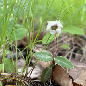 ウメガサソウ(梅笠草) ツツジ科ウメガサソウ属 花の形が梅に似て、かぶり笠のように下向きにつくことが名の由来 高さ7〜8cm程でしたが草ではなく常緑小低木 こちらは斜面に咲いていたのでお顔を見ることできました🤗 横向きの花も清楚で可憐🤍