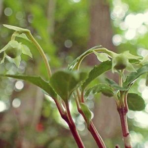 山奥自宅から奥山へ 大好きな場所にて 昨年の花あとを残したまま開花間近のウメガサソウ まだ薄い黄緑色の花が初々しい