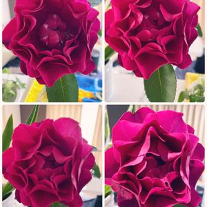 今日はお休みだったので、オデュッセイア様の観察ができました。左上から右に 朝、午後3時、午後4時、午後8時で花びらがどんどん開いてきました。 なんと素敵なお姿でしょー。感動です✨🌹