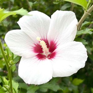 🌸ムクゲ(槿) 朝に咲いて夕方しぼんでしまうので、槿花一朝(きんかいっちょう)と言う四文字熟語にもなっています。人の栄華は続かないと言う意味なんですね… ⚫︎アオイ科 フヨウ属 ⚫︎原産 中国 ⚫︎花期 7月〜10月