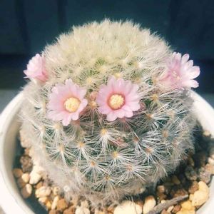 サボテン マミラリア属 カルメナエ 二輪咲いてから止まってた蕾が 一カ月して再開😊 王冠は難しいそうだけど次々と 咲きそう🥰