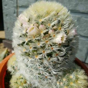 こんにちは! 朝から曇り☁で寒いです! こんな時でも、クリローさん以外も頑張ってます。 久しぶりサボテン、マミラリヤ『カルメナエ』さんです! お子様が襟巻きしてモフモフな棘で暖かそう、触っても痛くないです! 淡いピンクのお花が、可愛いです!